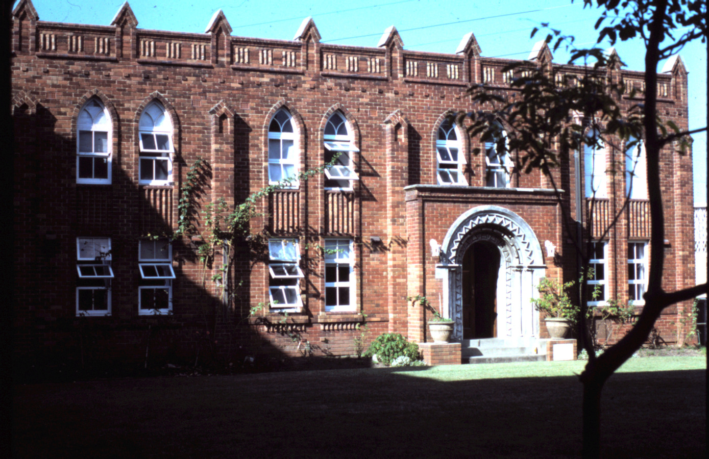Moore College - as it looked between 1903 (when the Broughton Memorial Chapel was rebuilt) and the 1940s (when the chapel was demolished to make way for more student residences). Digitised from a glass plate negative.